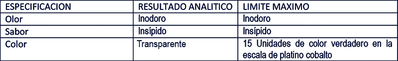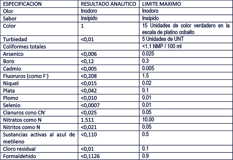 El agua que es envasada por Agua Purificada los volcanes S.A. DE C.V., es un agua que cumple con las características fisicoquímicas y microbiológicas que marca la Norma Oficial Mexicana NOM-127- SSA1-2004, "SALUD AMBIENTAL, AGUA PARA USO Y CONSUMO HUMANO-LIMITES PERMISIBLES DE CALIDAD Y TRATAMIENTOS A QUE DEBE SOMETERSE EL AGUA PARA SU POTABILIZACION"